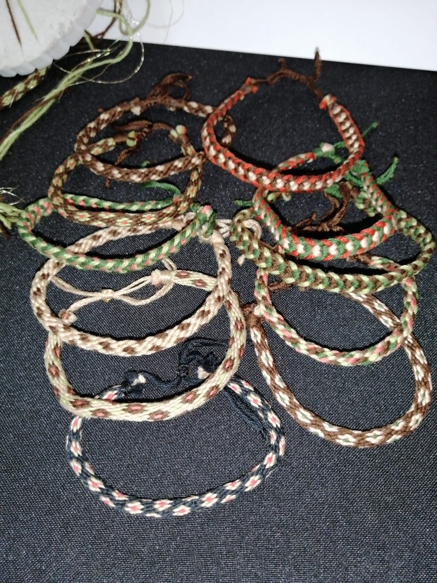 Nos especializamos en la confección de pulseras con la técnica de kumihimo y macramé, collares para las mascarillas, además de la elaboración de zapatillas elaboradas con hilo primor.