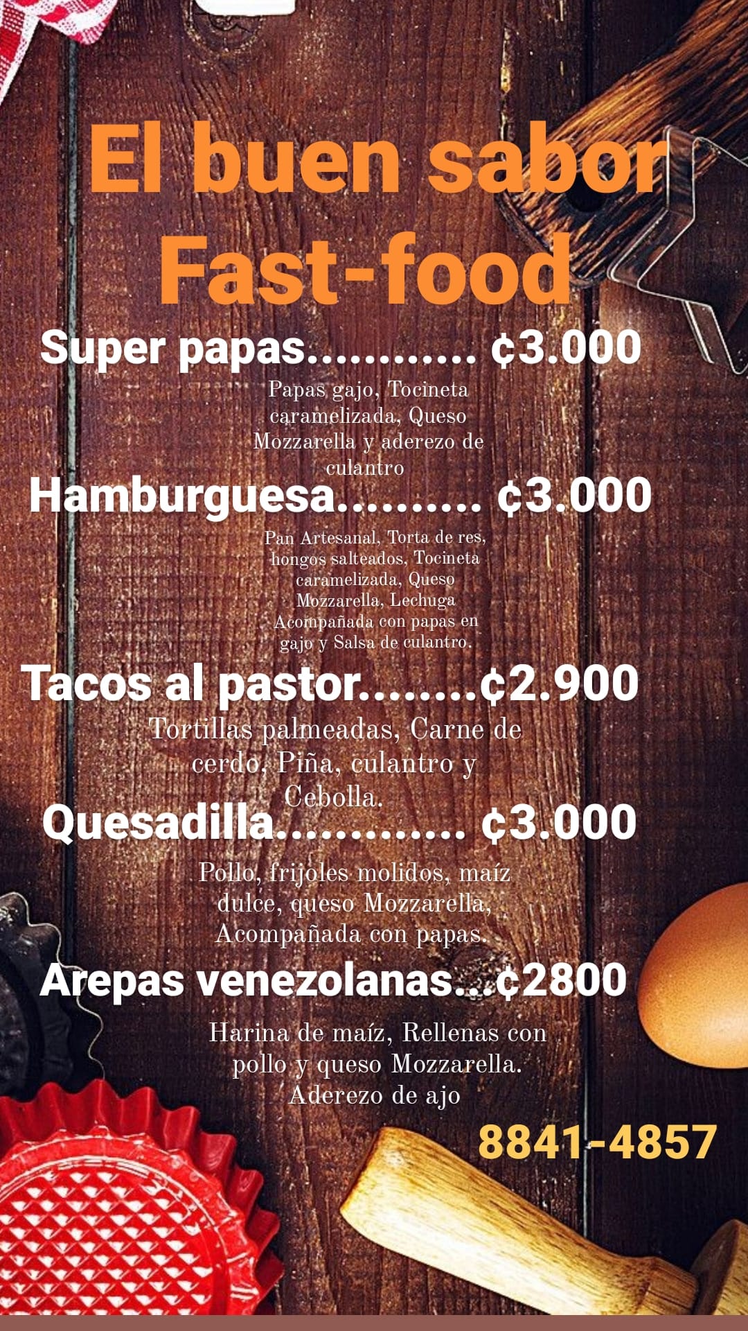 Nos ofrece sabores diferentes platillos como: tacos al pastor, arepas venezolanas, quesadillas, hamburguesas, papas, entre muchos más.