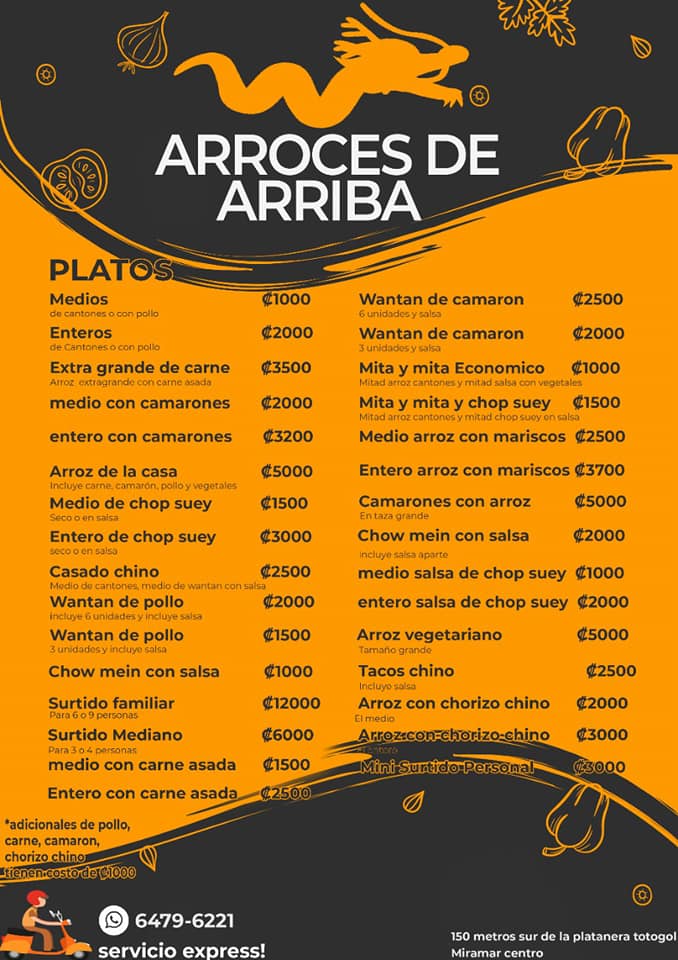 Los Arroces De Arriba, la mejor comida china de Miramar les ofrece riquísimos arroces cantonés, de camarón, con pollo, también vendemos surtidos, wantán en salsa, casado chino, y mucho más, lo mejor de todo esto es que tenemos el mejor precio, contamos con servicio exprés y pagos por sinpe móvil.