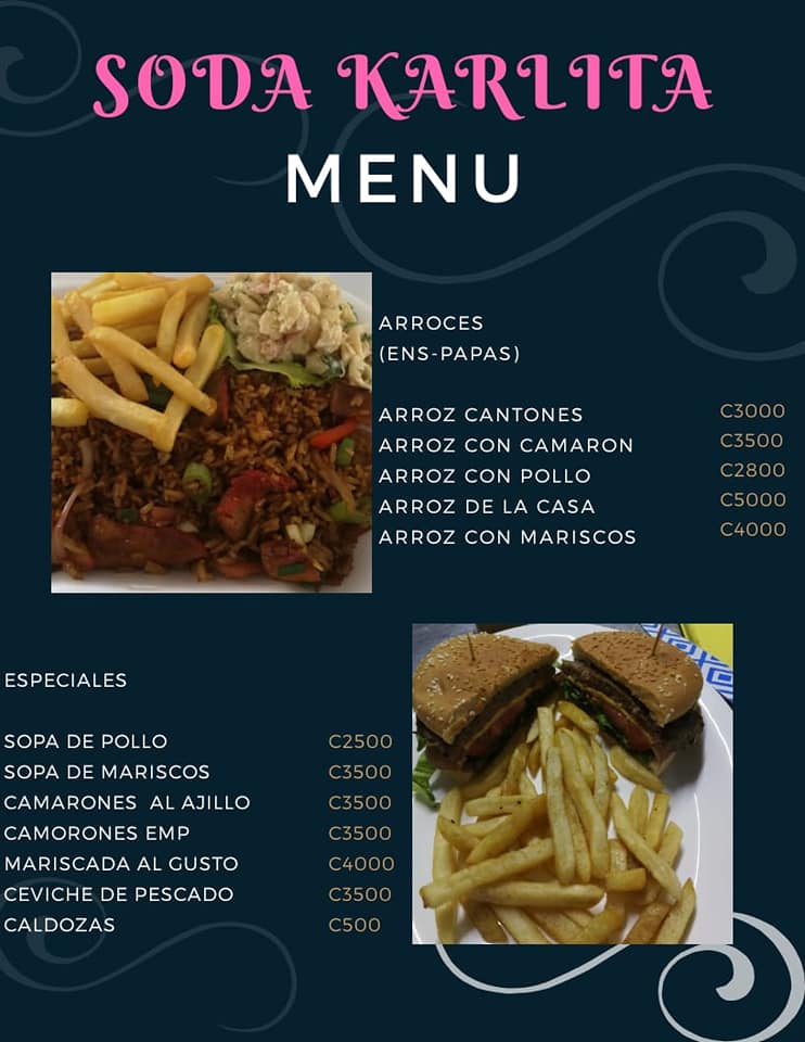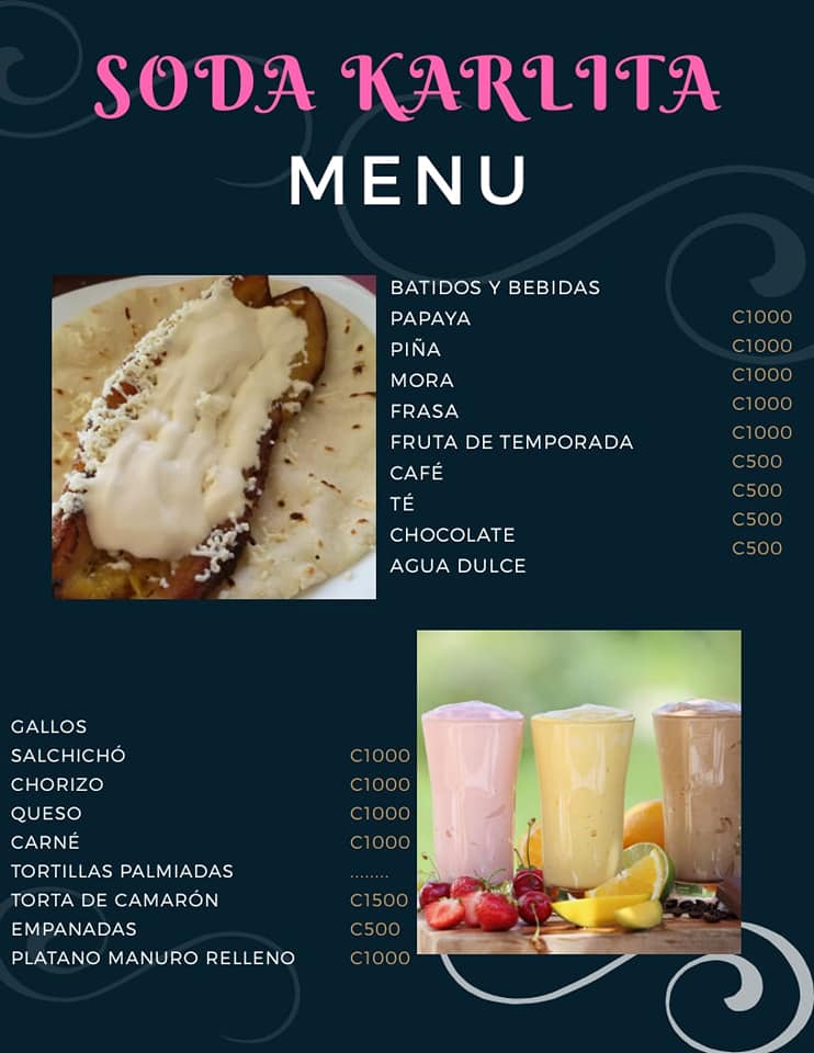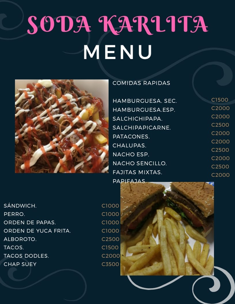 En soda Karlita puedes encontrar variedad de platillos y batidos deliciosos, ideales para desayunos o almuerzos, también ofrecemos comidas rápidas como: hamburguesas, patacones, nachos, tacos, sandwich y mucho más . Visítanos, no te arrepentirás!
